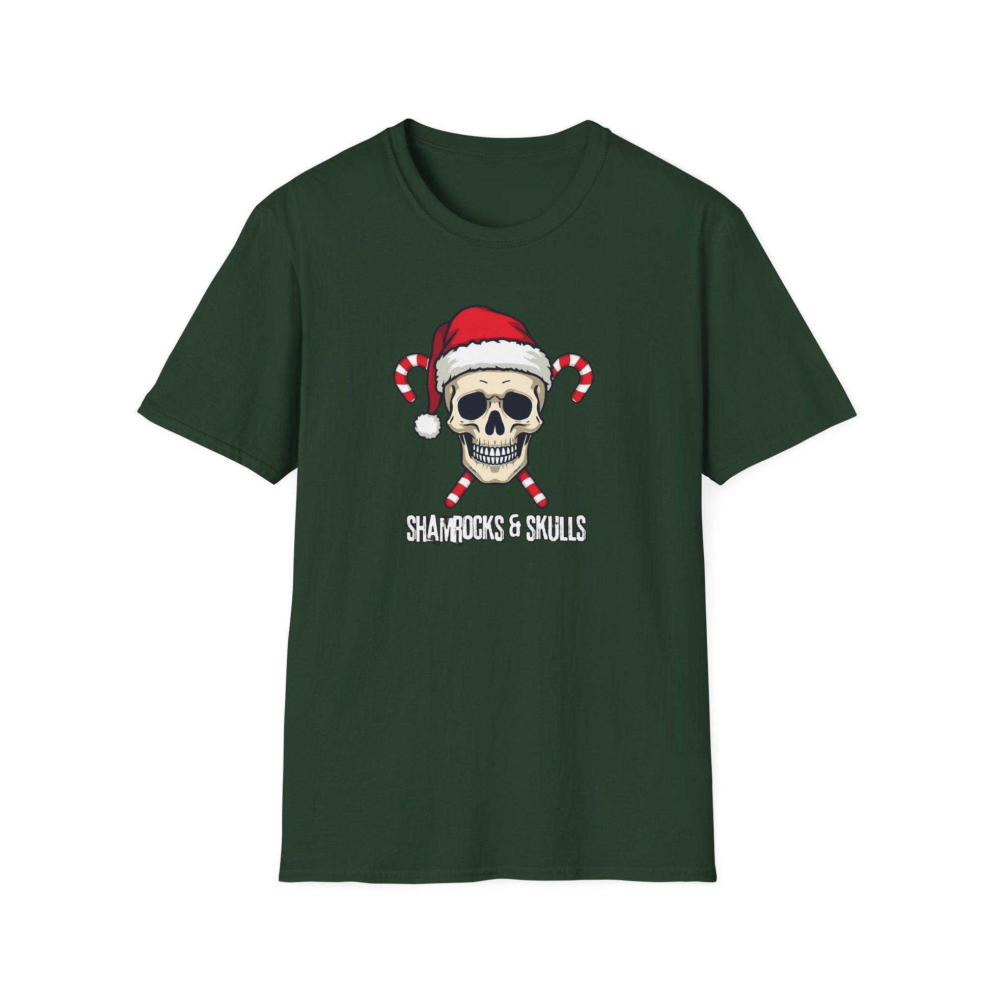 A tough little holiday tee with attitude. The design pairs a cheeky skull wearing a Santa hat with crossed candy canes — holiday imagery turned on its head. Lightweight and smooth, the shirt sits close to the body without feeling heavy, so you can wear it layered under a jacket at a concert or solo at a laid-back ugly-sweater party. The collar holds its shape after repeated wear, and the shoulder tape keeps the tee from stretching out when you toss it on. Printed with vivid methods that hold fine details, the graphic keeps its contrast wash after wash. Wear it to show off a darker sense of seasonal humor, bring it to a house gathering that leans irreverent, or slide it on for late-night caroling with friends who prefer riffs to saccharine carols.
